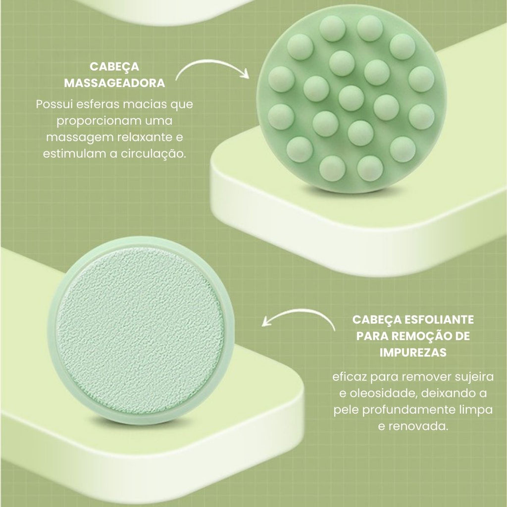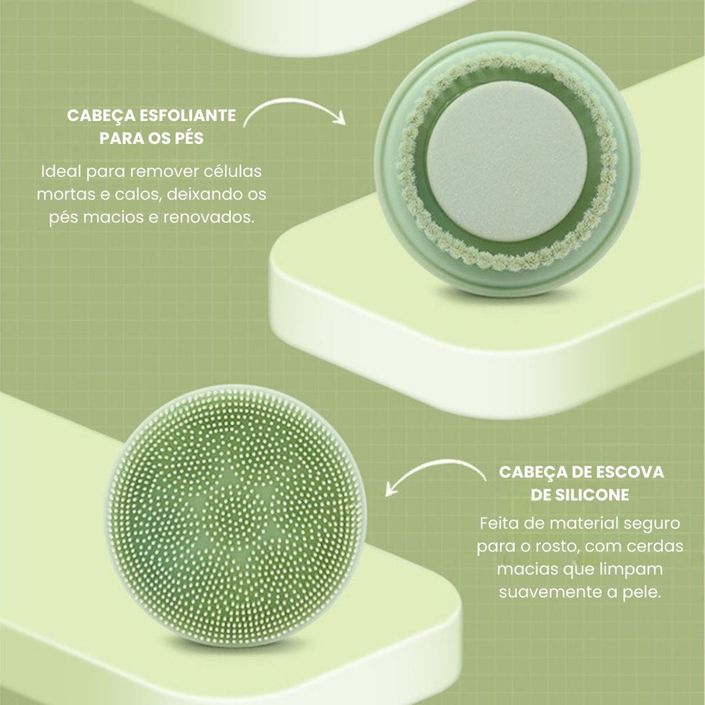 Possui 5 cabeças! Uma escova ultra macia com cerdas de nylon, uma escova om cerdas de silicone, uma esfoliante suave para o corpo, uma esfoliante intenso para os pés e uma massageadora!